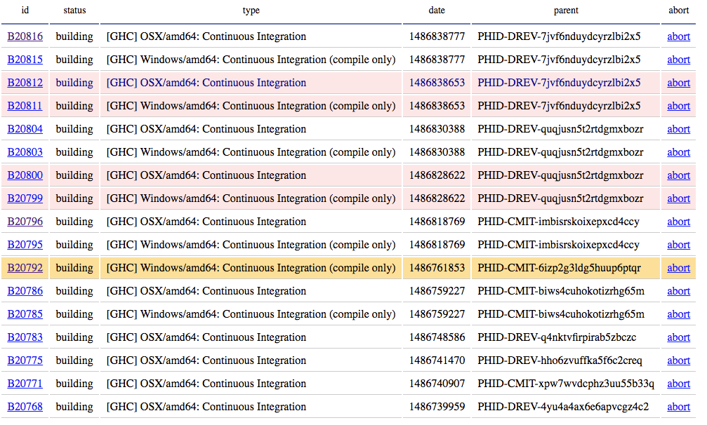 #13240: Make it easier to find builds we may want to cancel -------------------------------------+------------------------------------- Reporter: dfeuer | Owner: mpickering Type: feature request | Status: new Priority: normal | Milestone: 8.4.1 Component: Trac & Git | Version: 8.0.1 Resolution: | Keywords: Operating System: Unknown/Multiple | Architecture: | Unknown/Multiple Type of failure: None/Unknown | Test Case: Blocked By: | Blocking: Related Tickets: | Differential Rev(s): Wiki Page: | -------------------------------------+------------------------------------- Comment (by mpickering): I implemented a simple web dashboard which shows when situations 1. and 2. are occurring. The question now is whether this should be hosted somewhere or if anyone other than me would use it. Red = 1 Orange = 2 The code is also not very pretty and I am not too keen to tidy it up so I might just manage this myself. https://usercontent.irccloud-cdn.com/file/IZlVhIjK/ -- Ticket URL: http://ghc.haskell.org/trac/ghc/ticket/13240#comment:5 GHC http://www.haskell.org/ghc/ The Glasgow Haskell Compiler